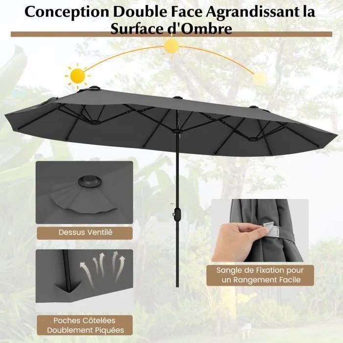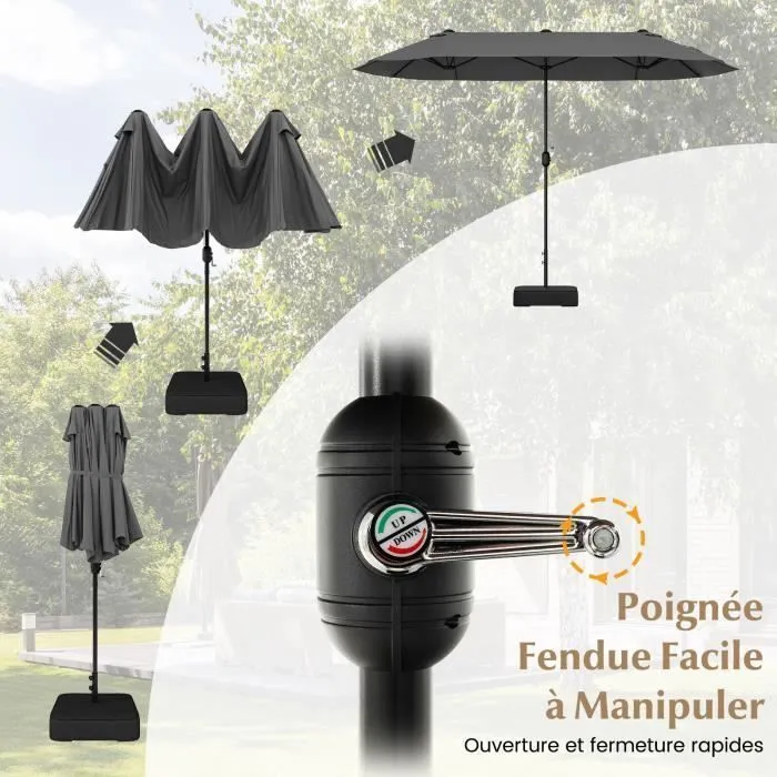 Parasol Double Rectangulaire XXL 396x201cm Gris avec Base Lestée et Manivelle – COSTWAY